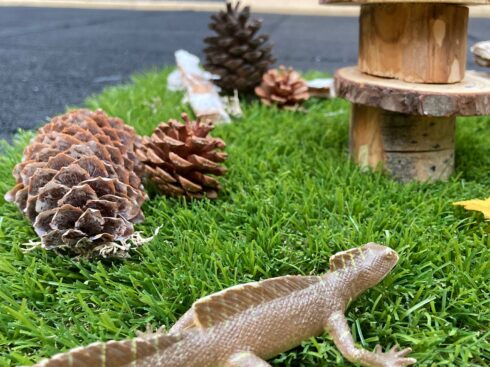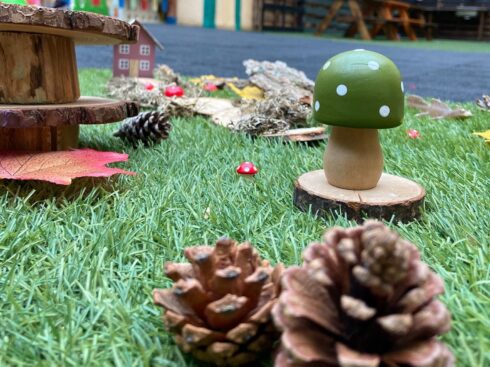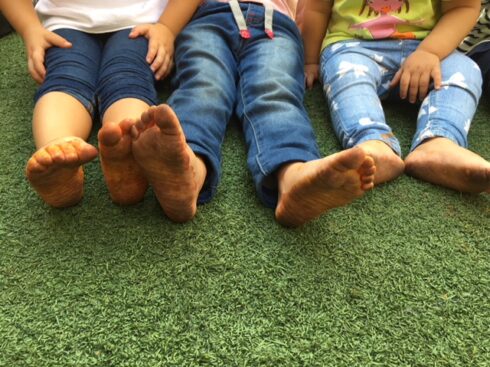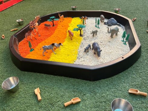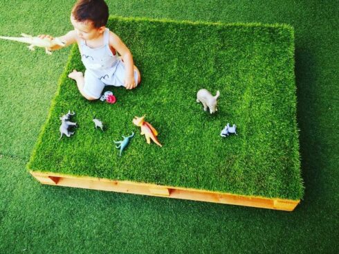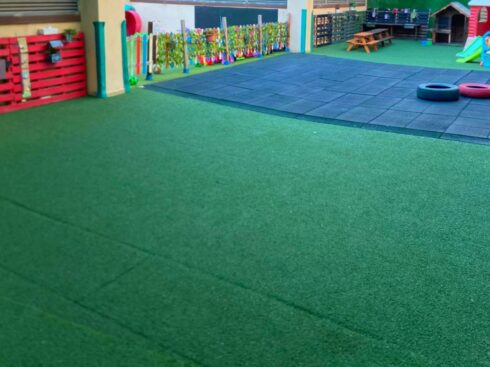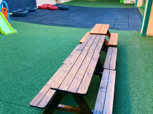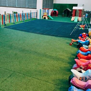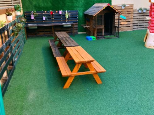 - Patio con pavimento de seguridad acolchado y toldos para los días de sol.