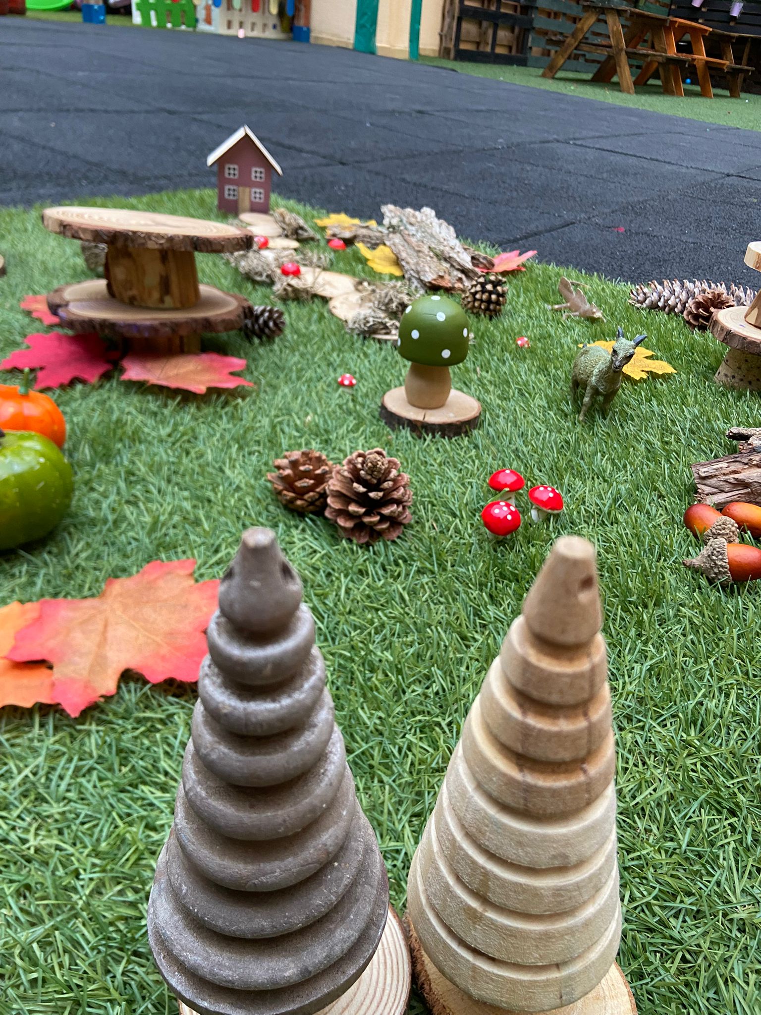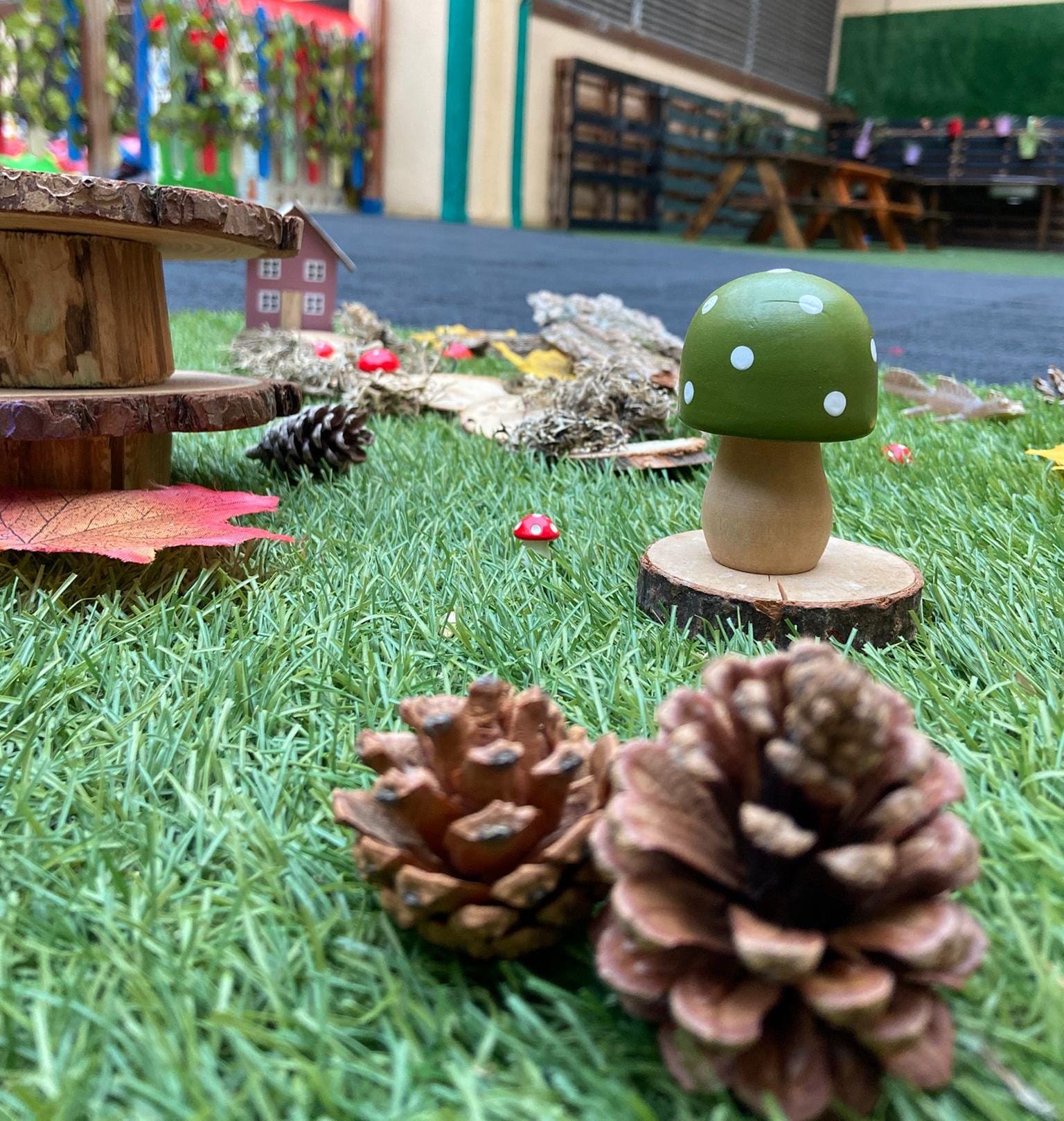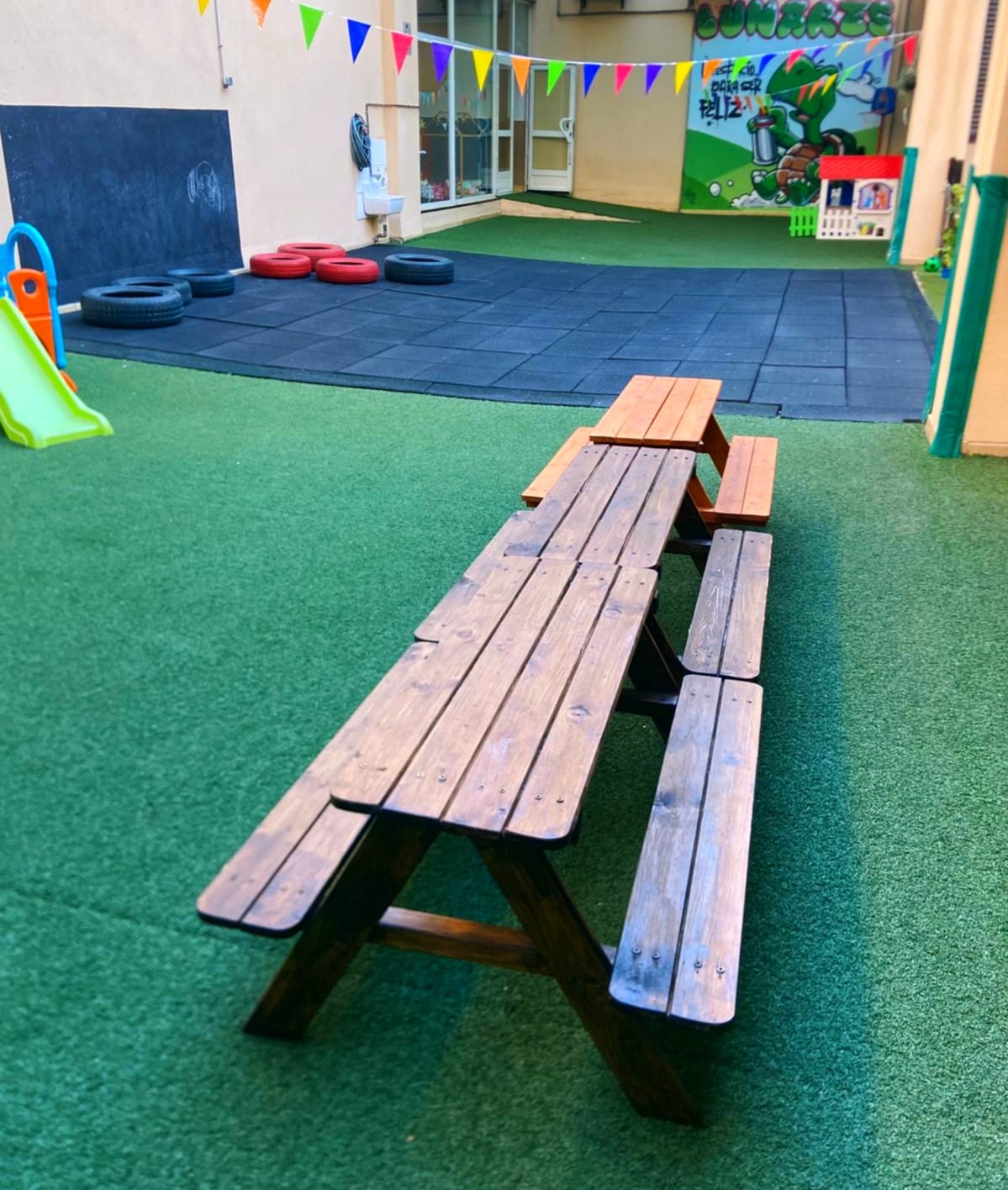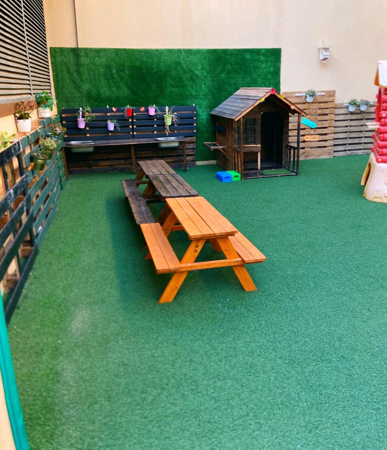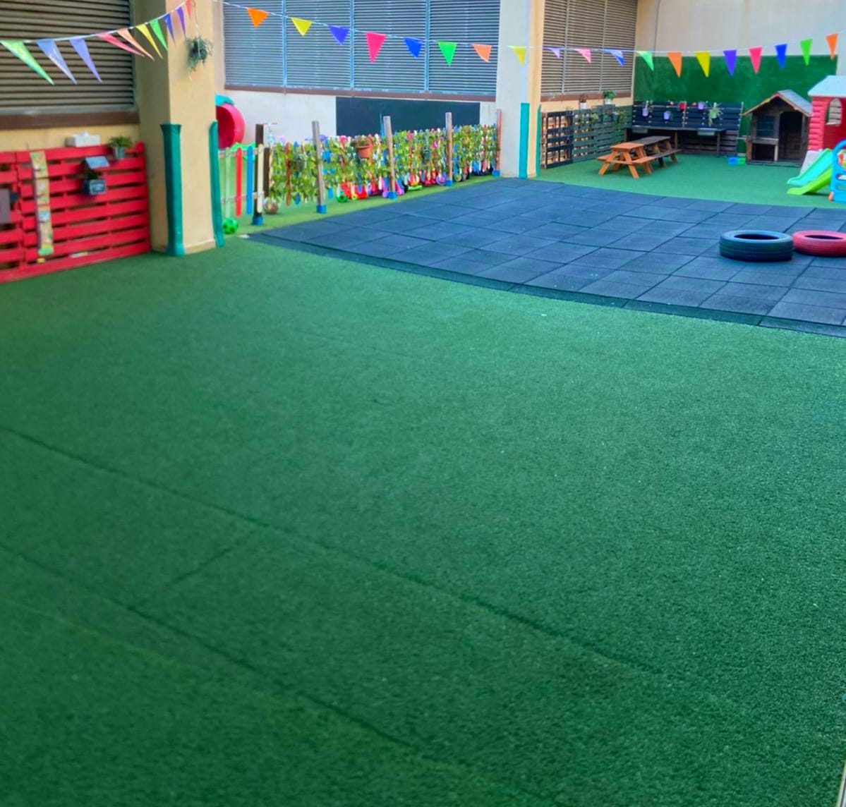 - Patio con pavimento de seguridad acolchado y toldos para los días de sol.